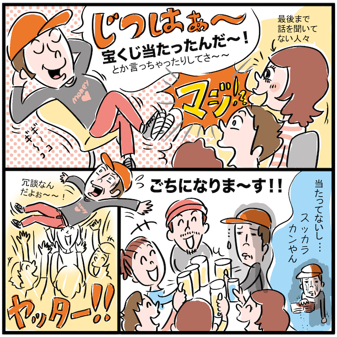 気づけば誰かが言い出すんです。「じゃあ今日は奢りですよね?」流れで「よし!じゃあ飲みに行くか!」と宣言してしまい、後輩全員を引き連れて強制飲み会へ。給料日前、財布はスカスカ。宝くじどころか、現実の残高は絶望的。その月は見事にもやし中心生活になりました。