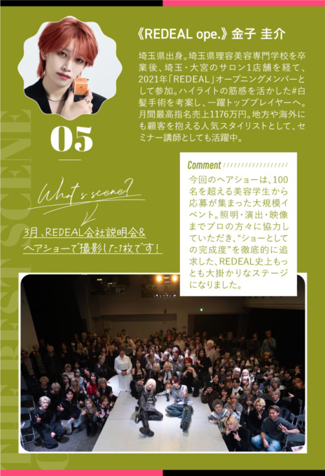 このヘアショーは、100名を超える美容学生から応募が集まった大規模イベントでした。 照明・演出・映像までプロの方々に協力していただき、 “ショーとしての完成度”を徹底的に追求した、REDEAL史上もっとも大掛かりなステージになりました。