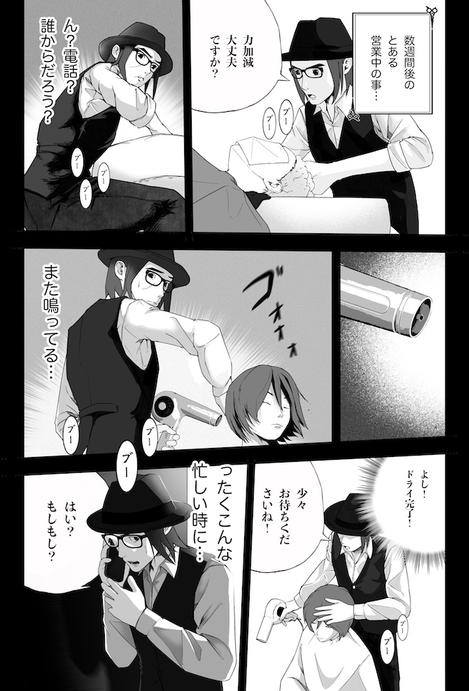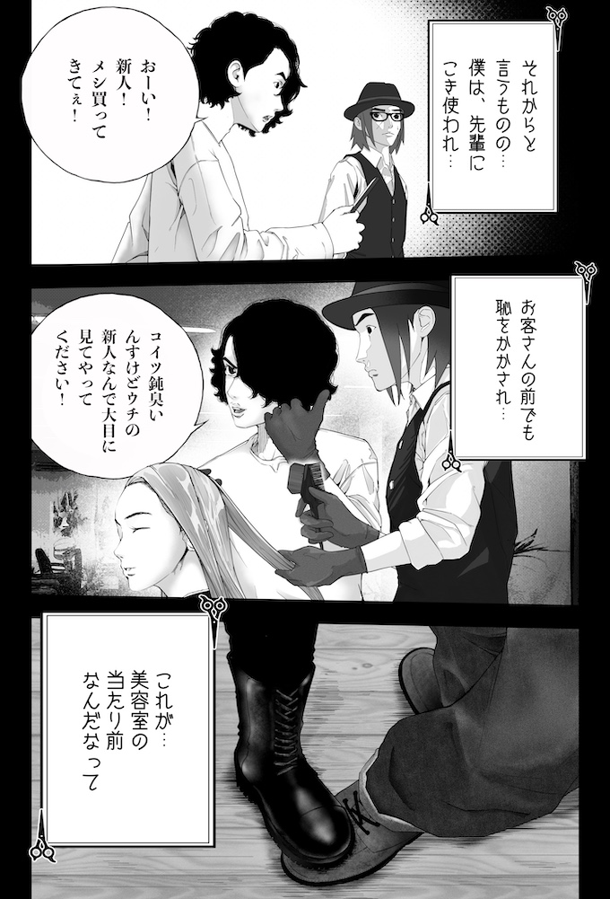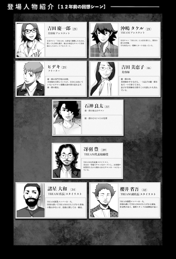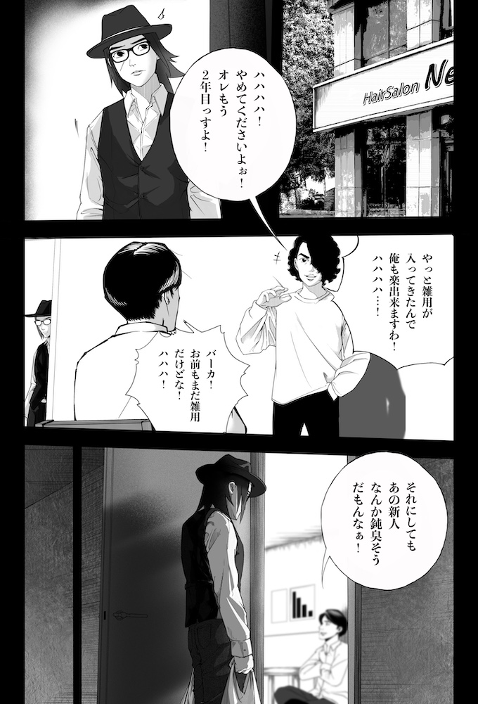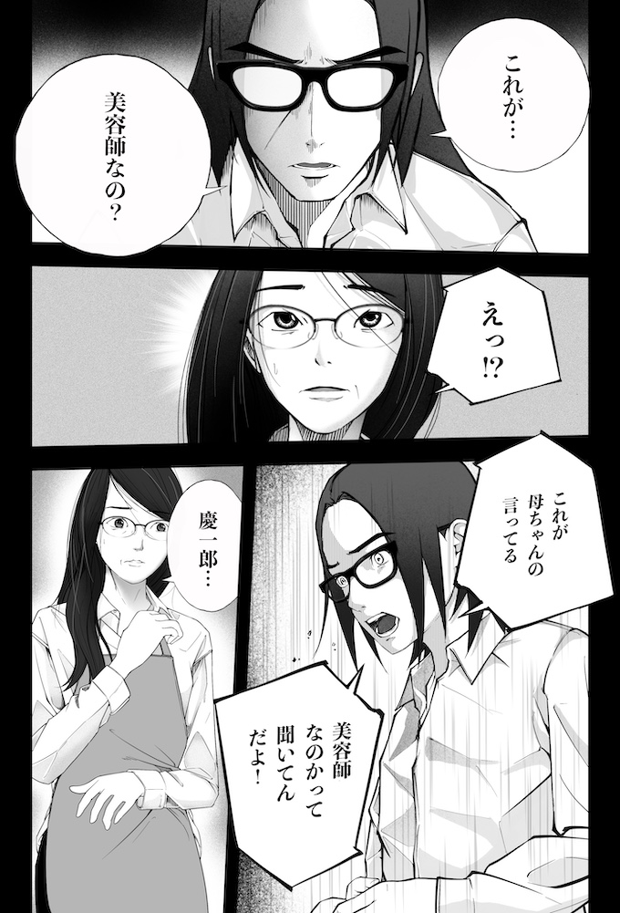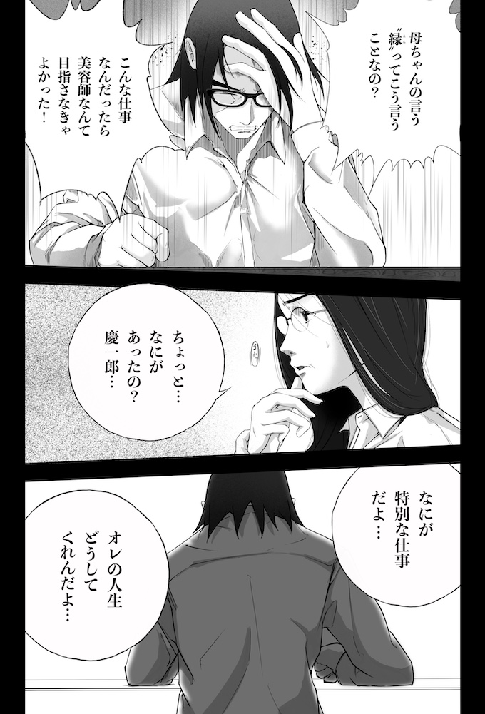 TREAMの面接の結果、慶一郎は不合格。一方で、沖嶋タケルは合格したと聞き、感じたことのない敗北感に打ちのめされます。結局、地元のサロンへ就職することになった慶一郎でしたが、やはりTREAMへの未練が捨てきれず、美容師である母からの激励も耳に入りません。複雑な心境のまま入社初日。先輩への挨拶もそこそこにいきなりトイレ掃除を命じられ、不穏な空気が漂う慶一郎の美容師生活がスタートしますが…。