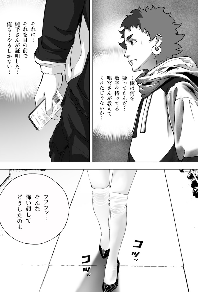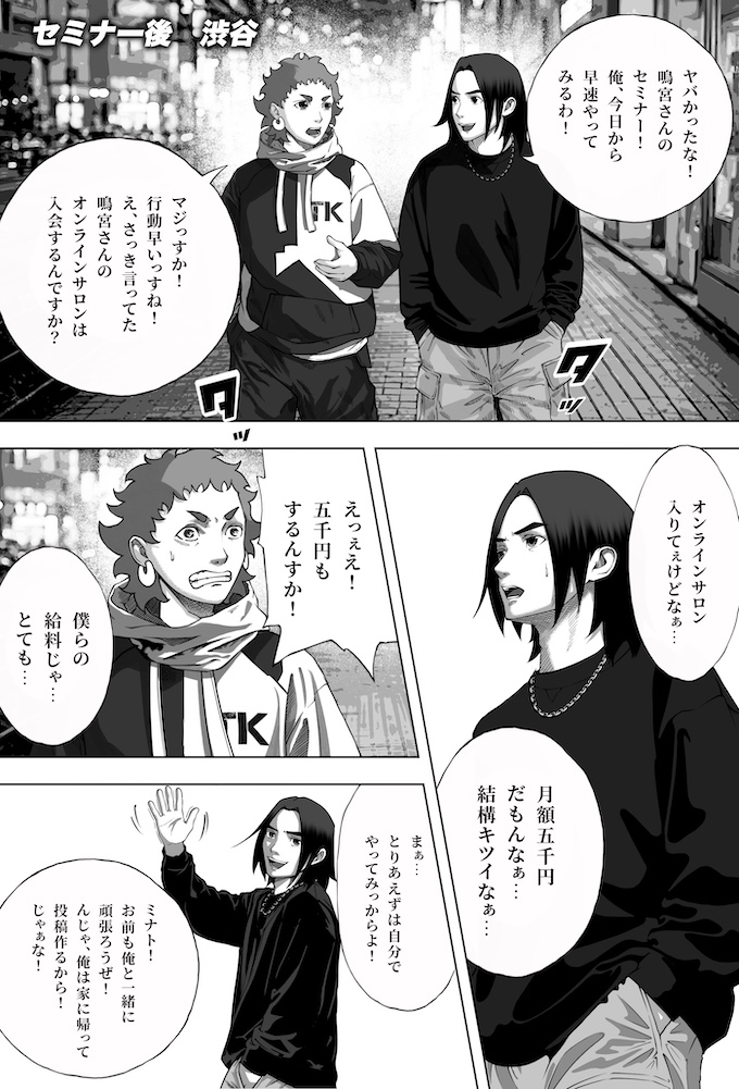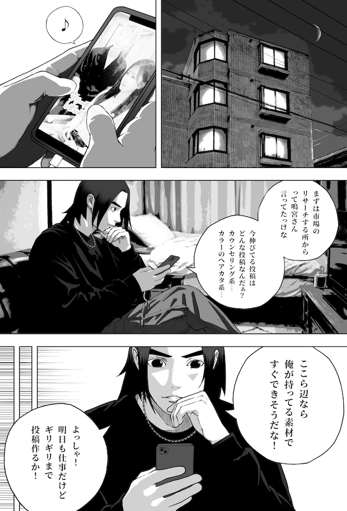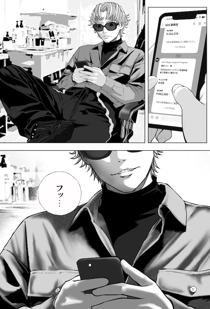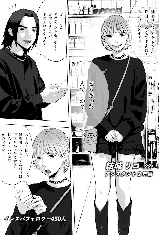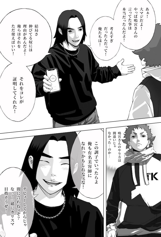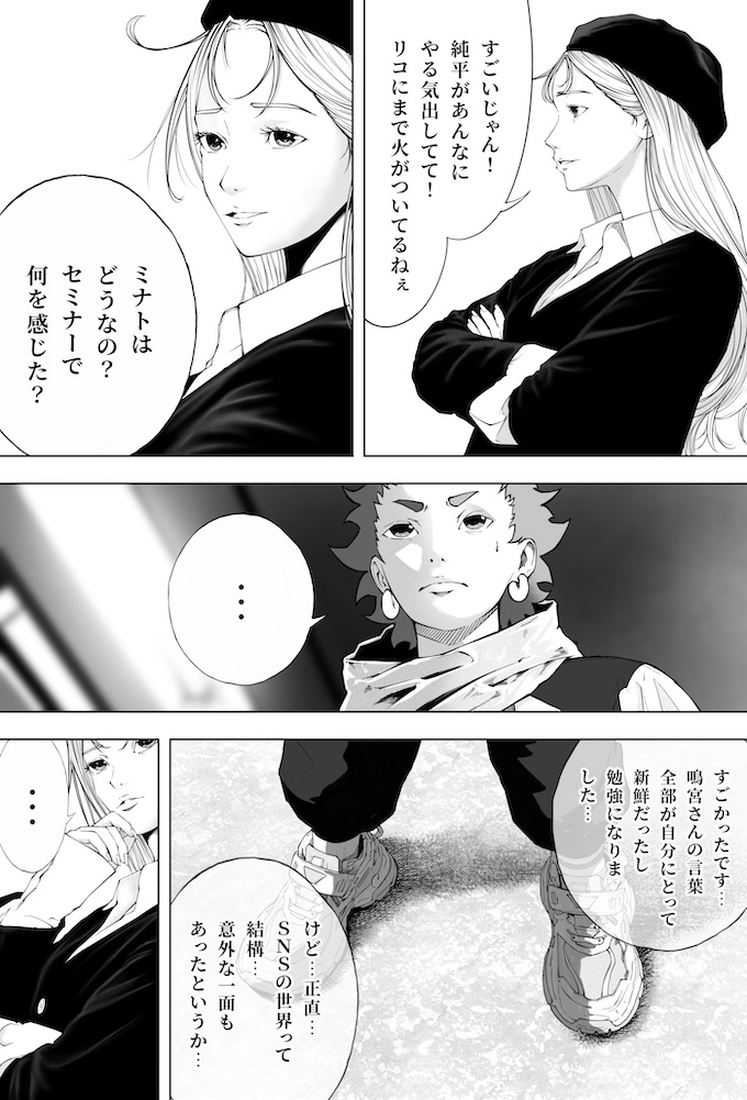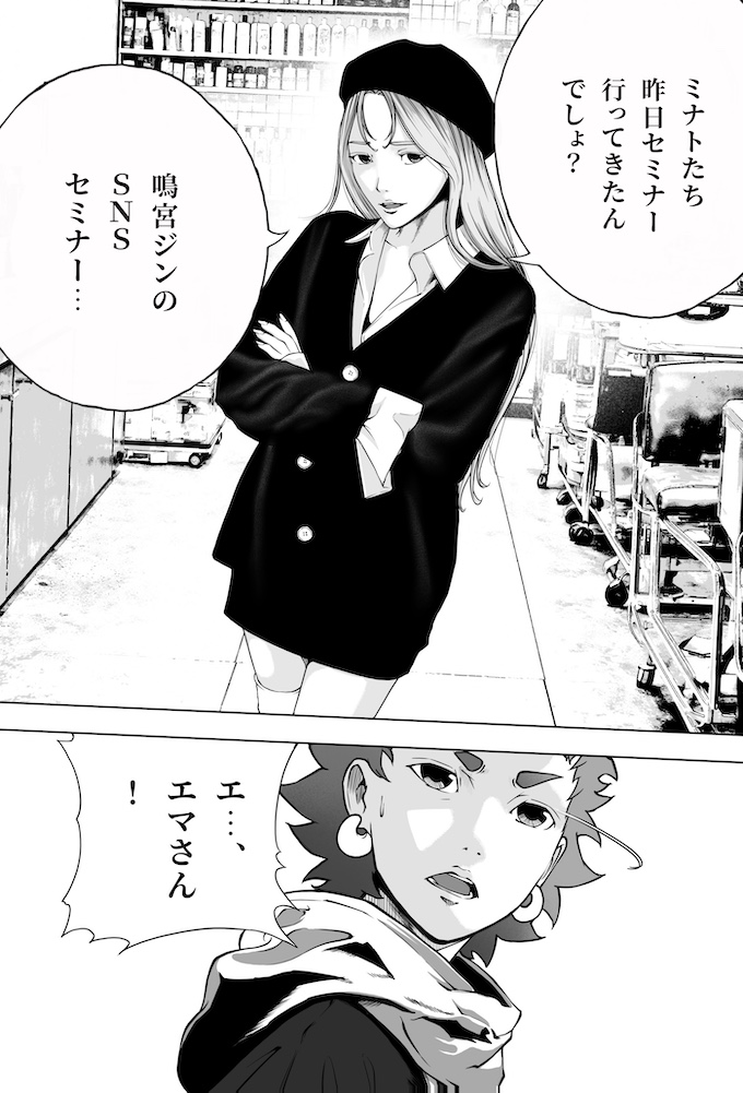 しかし、その答えがどうも腑に落ちない純平。彼はミナトを誘い、キングオブカリスマ候補の一人であり、インフルエンサー美容師・鳴宮ジンのセミナーへ足を運びます。そこで鳴宮が語ったのは、エマとは真逆の持論。