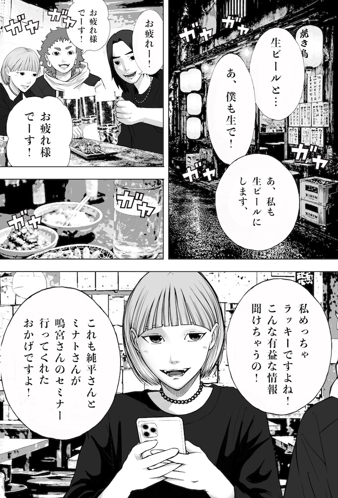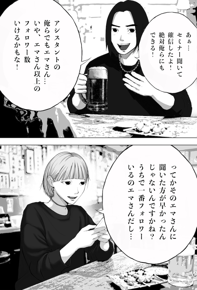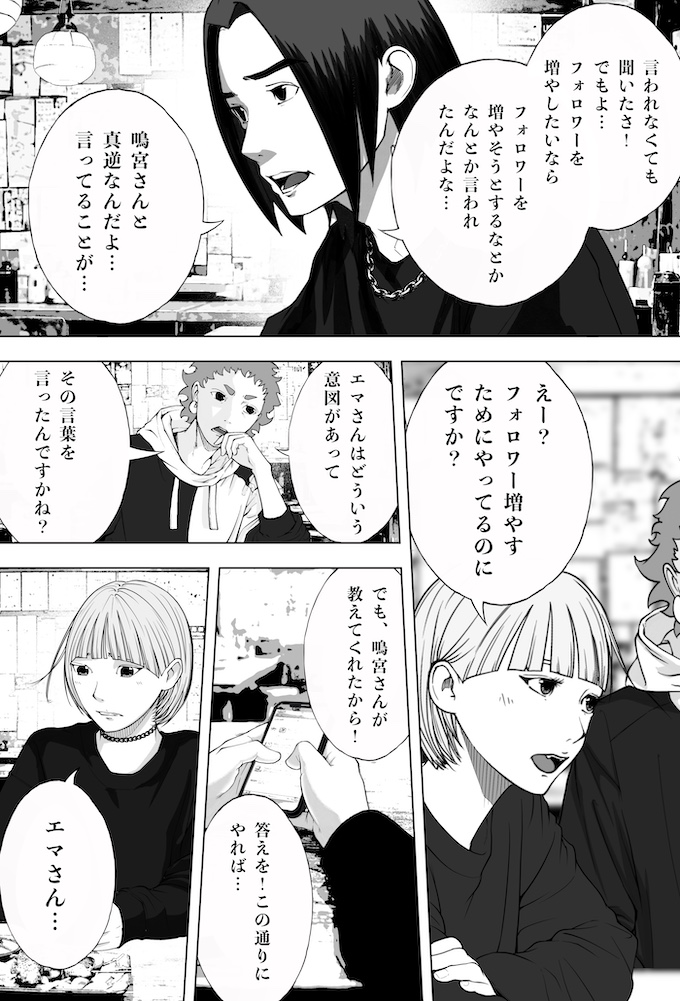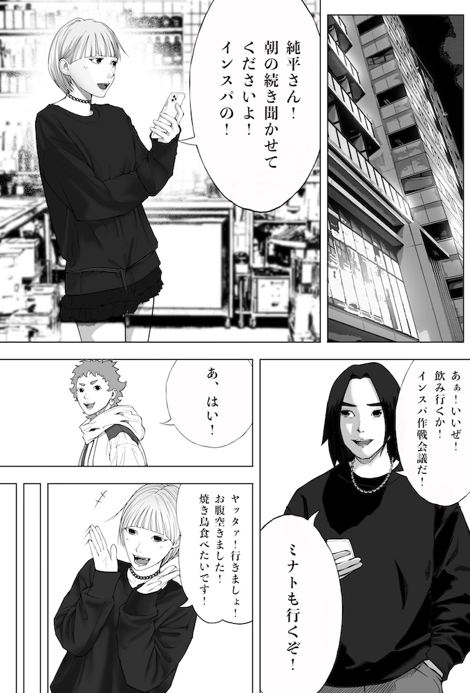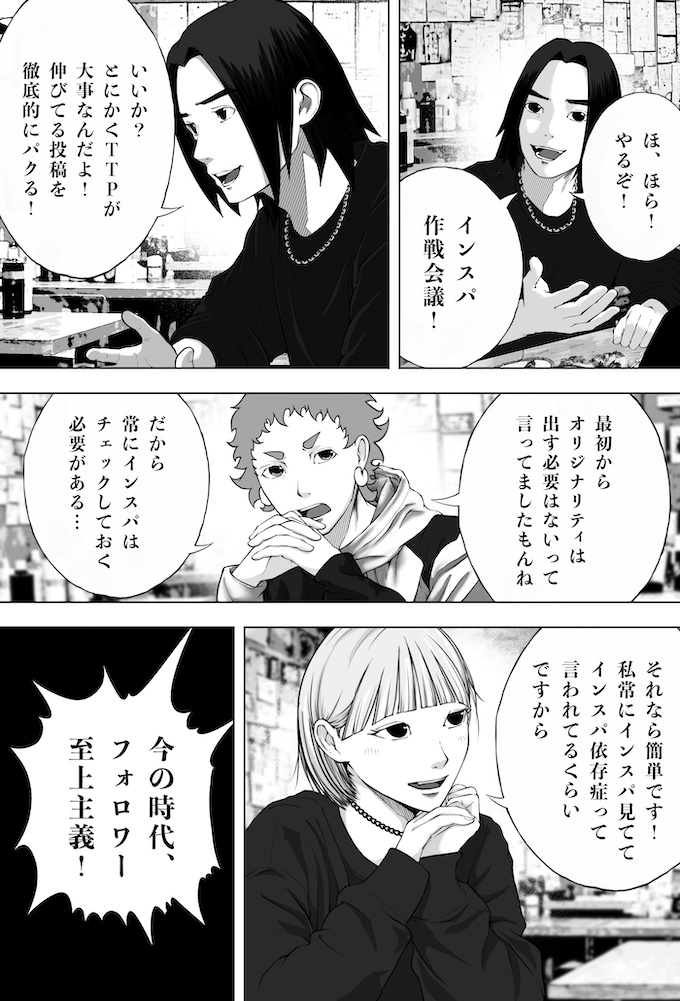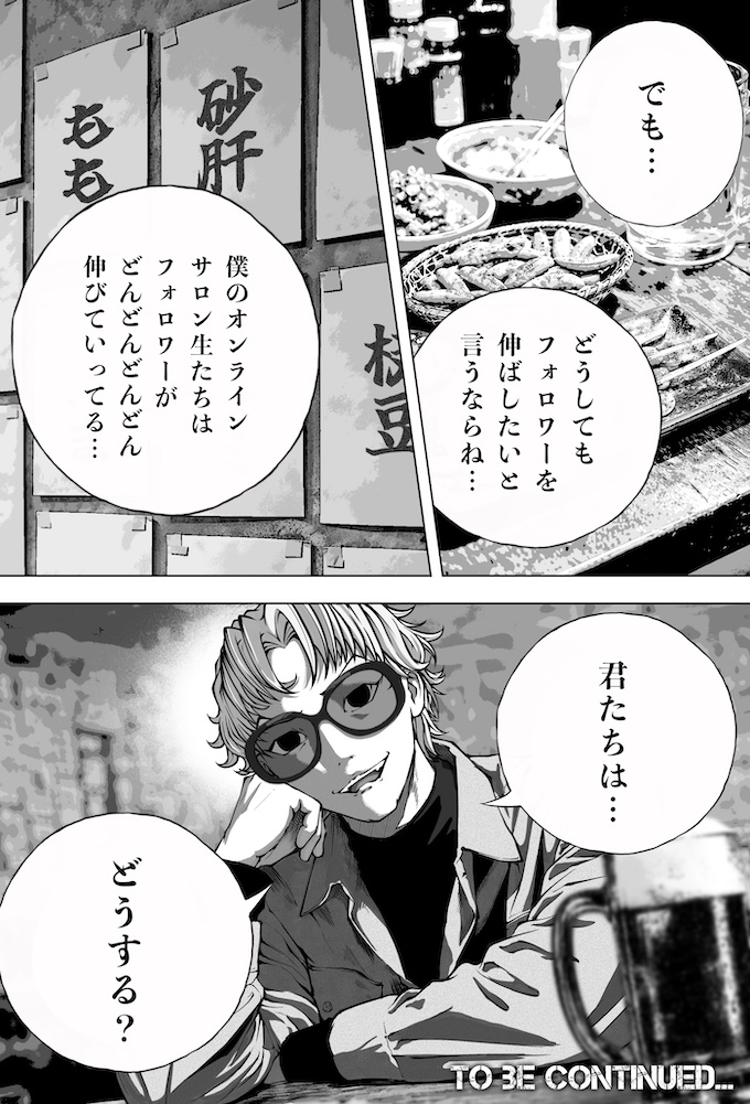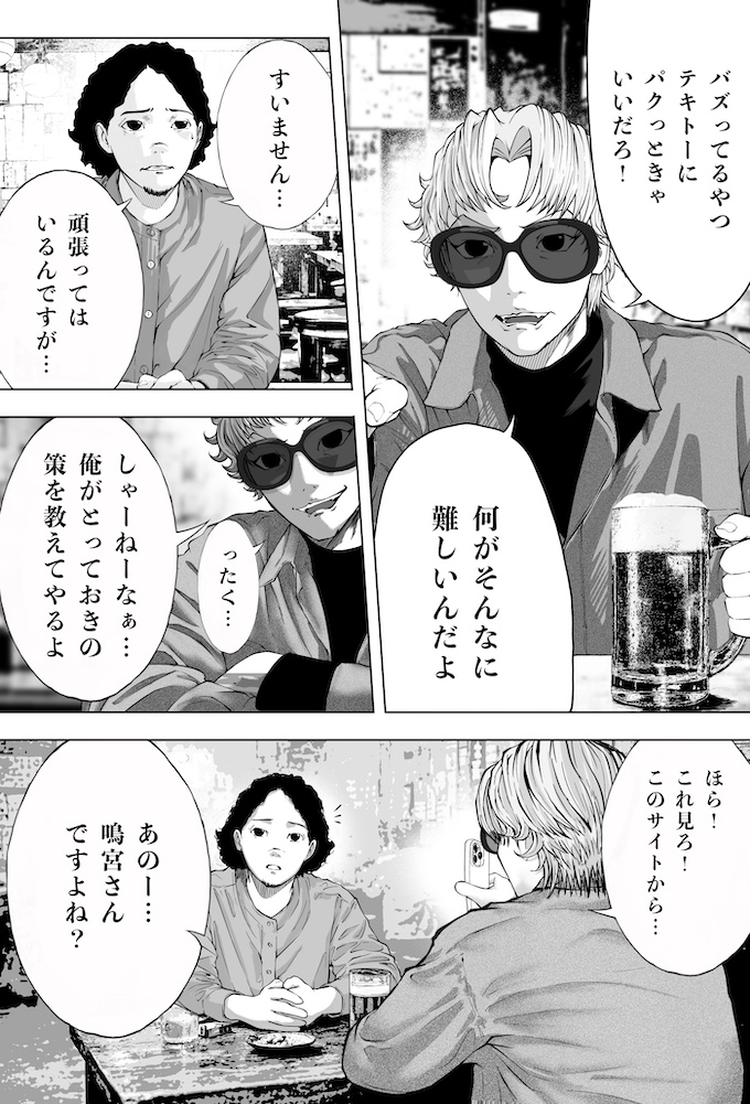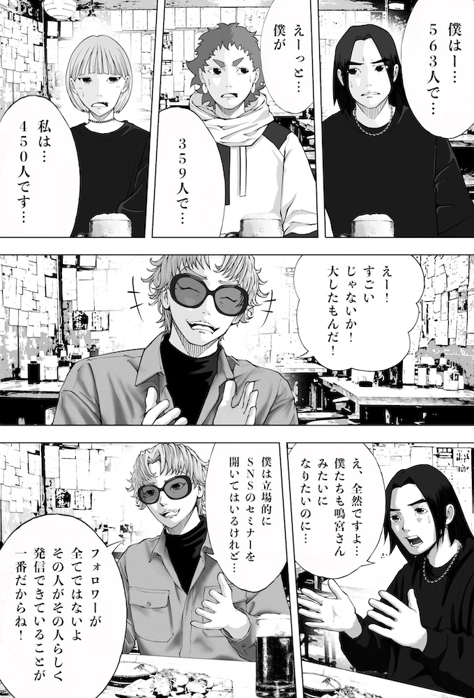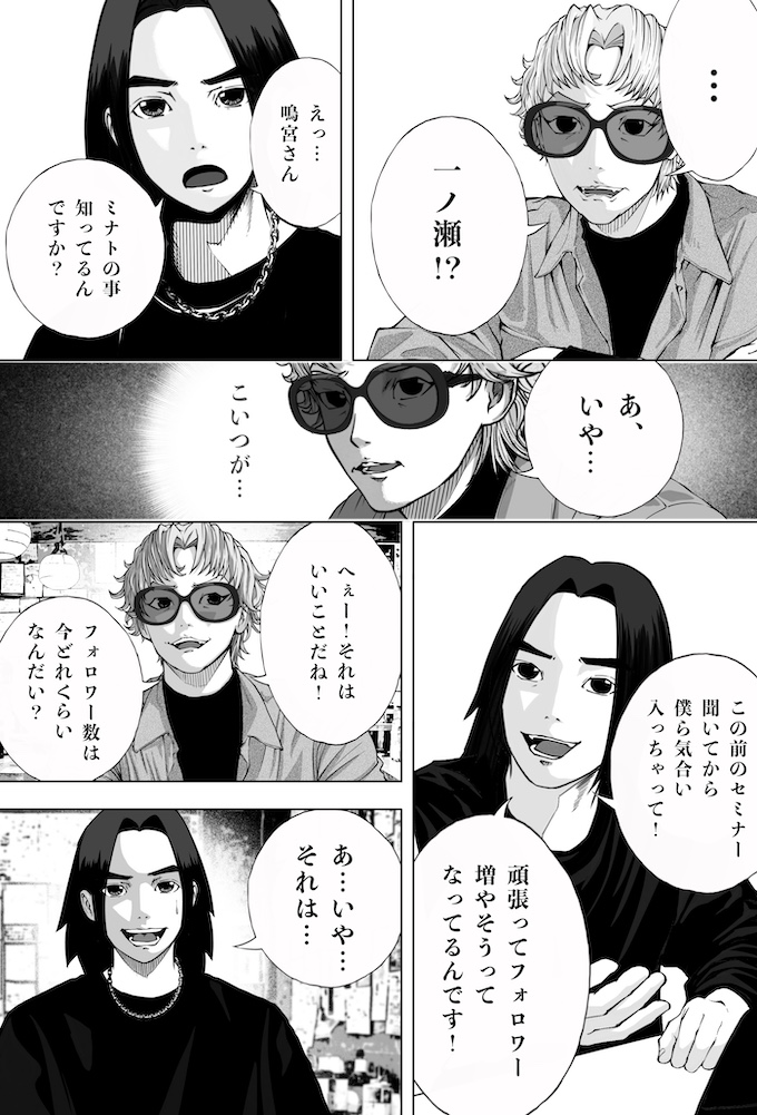 純平とミナトは、キングオブカリスマ候補の一人であり、インフルエンサー美容師・鳴宮ジンのセミナーへ参加します。そこで鳴宮が語ったのは、「フォロワーを増やすのにオリジナリティなんていらない。伸びている投稿を“徹底的にパクれ”」という衝撃的な持論。その教えを実践した純平のショート動画は、一夜にして1万回再生を記録。確かな手応えを掴み始めます。一方で、他人の投稿をパクることに違和感を抱き、踏み出せずにいるミナト。純平の結果を目の当たりにし、焦りだけが募りますが…。