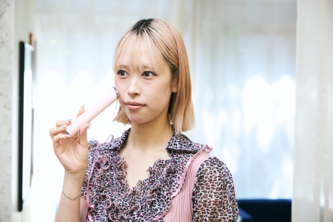 この美顔器はQoo10で買ったもの。美容液をつけてからこれを使うと、浸透が高まるそうです。確かに、使い始めてから毛穴がキュッと引き締まった感覚があります。それと、ロンドンに2カ月滞在していた時、硬水が合わなくて肌が荒れてしまったんですけど、この美顔器を使っていたおかげか、ニキビ跡とかも治るのが早かったですね。美容液の浸透がいいからかなと思って、欠かさず使うようにしています!