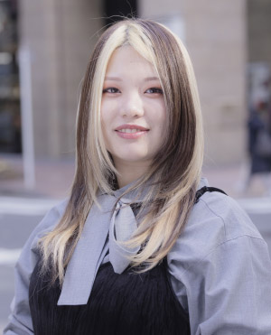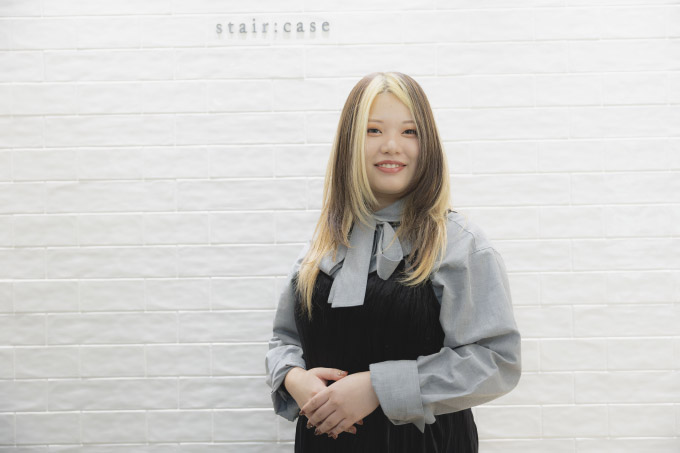 埼玉県出身。山野美容専門学校卒業後、都内2店舗を経て2021年にstair:case入社。難関カリキュラムを突破し、歴代最速の1年8カ月でカラーリストデビュー。アイリストも兼業し、月売上140万円超えを達成。現在はスタイリストデビューを目指し、カット練習に励んでいる。