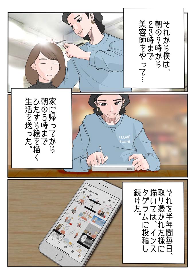 6話目は、TAKUOさんの現在の活動に至るまでのストーリーが描かれています。美容師兼イラストレーターとして大きく飛躍するきっかけとなった出来事とは・・・
