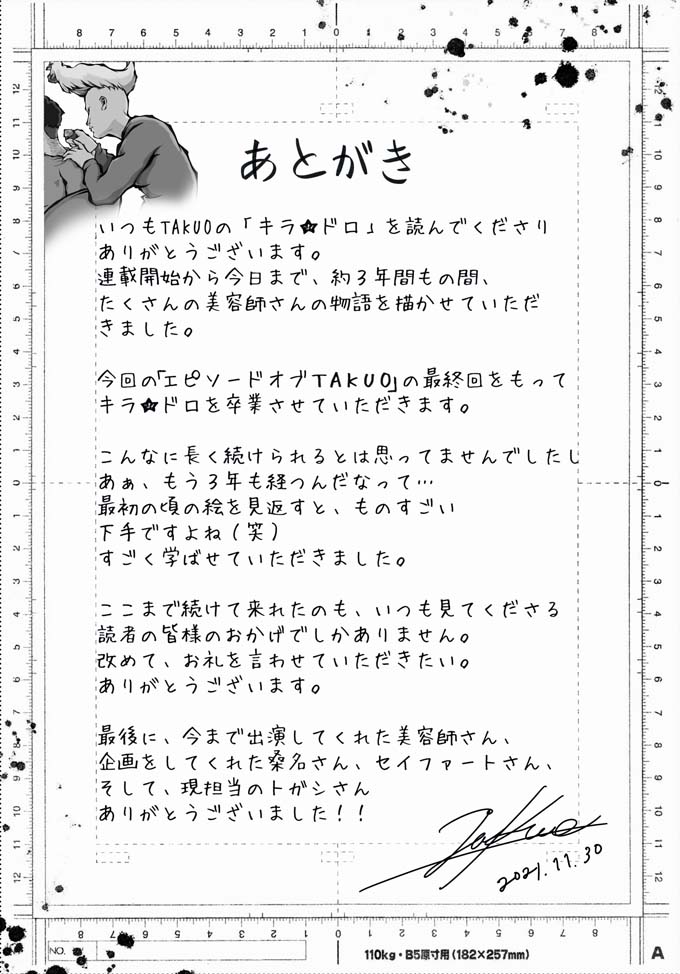 そして、「あの人のキラ☆ドロ美容師物語」連載も今回でフィナーレ。出演いただいた沢山の美容師さん、ありがとうございました! 最終コマのTAKUOさんのメッセージまで、ぜひご覧ください。