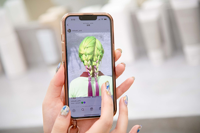 デザインの発想は、営業中に考えることが多いです。お客さまから、思いも寄らないデザインカラーをオーダーされることも多く、クリエイティビティを刺激されます。最近のオーダーで印象的だったのは、「根元はライムで、毛先がパープル」というもの。ロングスタイルの方だったのですが、髪をおろしてもパンチがきいた印象になるし、編み込みをしても、グラデーションがとてもきれいに仕上がりました。