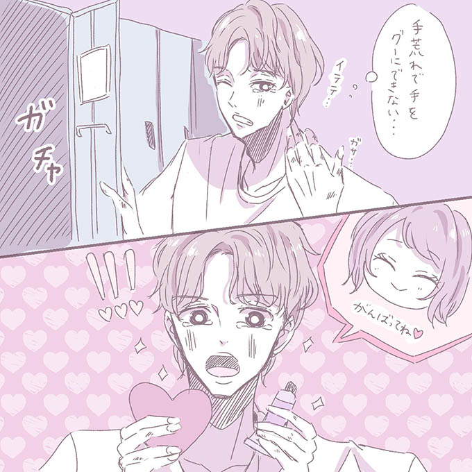 ある日バックルームに戻ると、自分のロッカーに見たことがないハンドクリームが。さらに「私もこれ使って克服できたから、頑張って♡」と、女性スタイリストからの手紙も添えられていました。これには、思わず胸キュン! すぐにお礼の連絡をすると、「悩んでるの気づいてたよ」と一言。自分が落ち込んでいるのを察していてくれたのだと知り、感動しました。