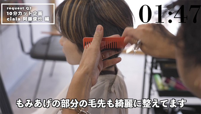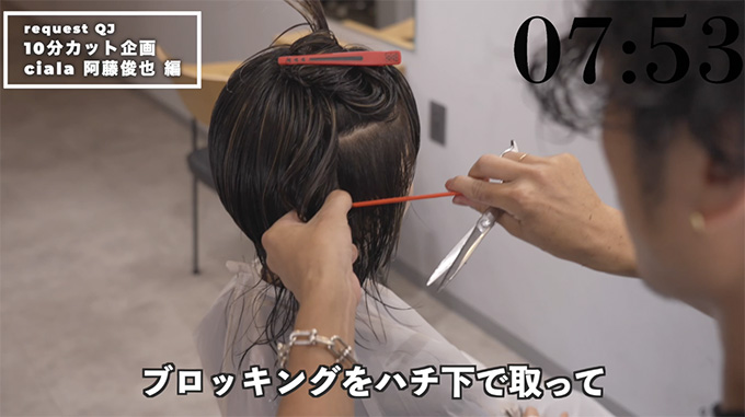 逆サイドも同様に、ハチ下でブロッキングし、すくい上げて、ディスコネのイメージでカット。やや下に下げて、レングスを決めるような感覚ですね。