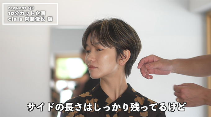 今回のスタイルは、しっかり長さは残ってるんだけど、アンダーセクションの軽さがポイント。こういったショートは、全部つないで切っちゃうとややメンズっぽくなりがちです。前髪は元の長さを残したまま、サイドの長さはオーバーラップさせながら、女性らしさを強調しています。