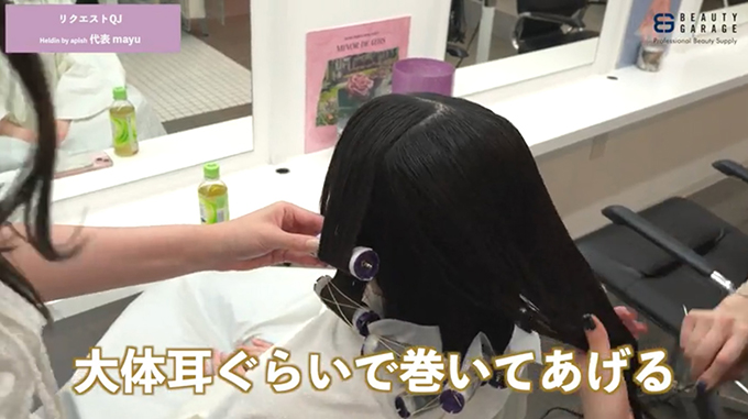 ブロッキングをする時は、前は2段、後は3段。デジタルパーマ用のロッドで、サイドは22ミリ、バックは20ミリで巻いていきます。軟化の時に大きくカールが出ていたので、アンダーセクションは細めで巻いておきます。耳下あたりにリッジが欲しいので、アンダーは顎ラインまで巻きます。