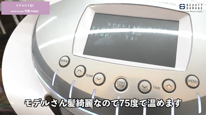 最初の5分は、通常の温度より5℃低めにします。カールの質感もよくなり、パーマの持ちも持続します。まずは75℃で5分、その後は80℃で8分おきます。