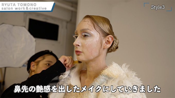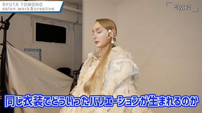 RYUTA:アップのスタイルなのですが、バレエっぽいニュアンスを入れつつ、バックはフィッシュボーンにしてシニヨンにまとめます。顔まわりにうねったような動きを出すことで、冷たさも表現。クラシックすぎない、モード感とのバランスもポイントです。