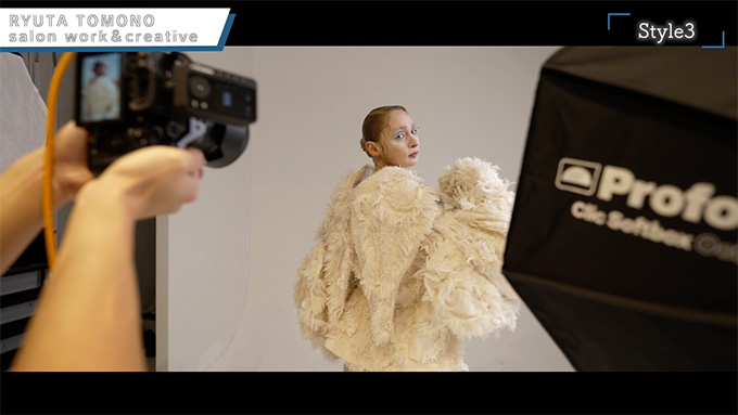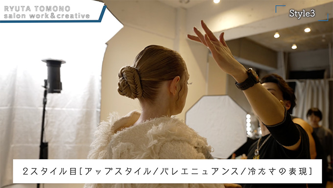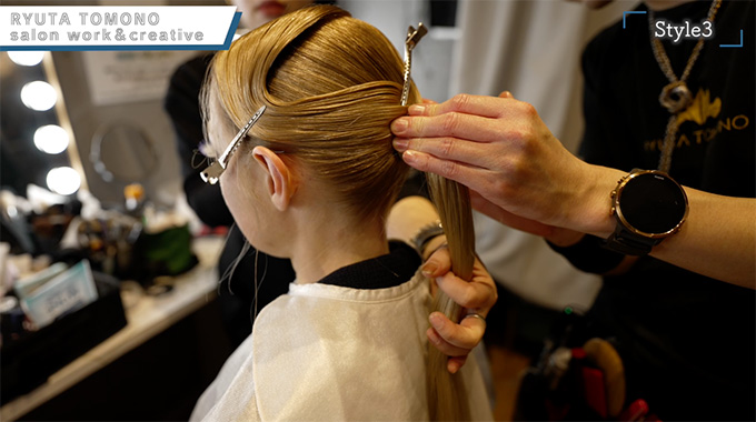 3スタイル目では、同じ衣装のまま、アップスタイルにチェンジ。頭の形に沿うように髪をまとめた後、ネットをかぶせてドライヤーで補強。数々のバックステージを経験してきたRYUTAさんならではの独創的なテクニックが飛び出しました。