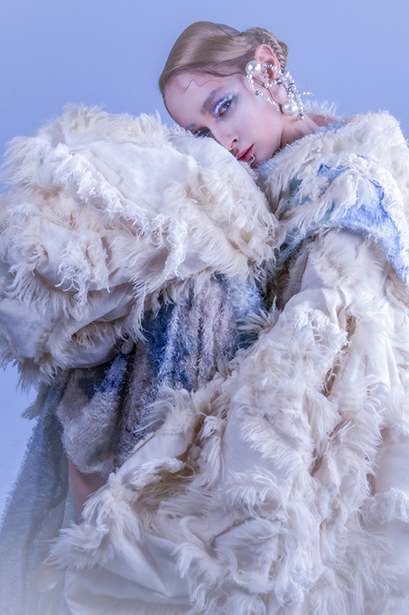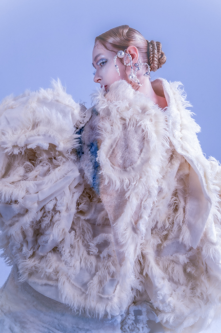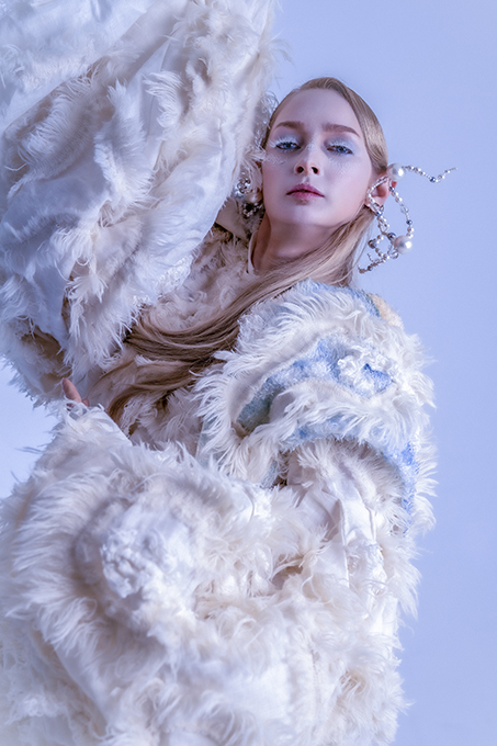 A.5 翌朝には陽光で消えてしまう、木々の蕾に積もった雪のような一瞬の美しさ。その幻のような瞬間を、現代のファッション・ヘア・メイクを通して再解釈しました。この作品は、日本と欧州、そして時代を超えて美しさを追い求め続けてきた私自身の「永遠への憧れ」を映し出した挑戦的な表現でもあります。