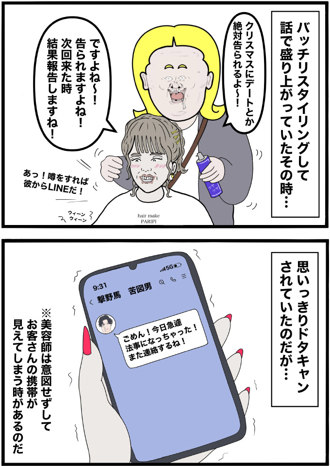 そんなイッヌさんが描く連載『美容師は見た!』シリーズ。美容室で巻き起こる、ちょっぴり笑える日常から思わぬ珍事件(!?)まで、美容師たちのリアルをマンガでお届けします。