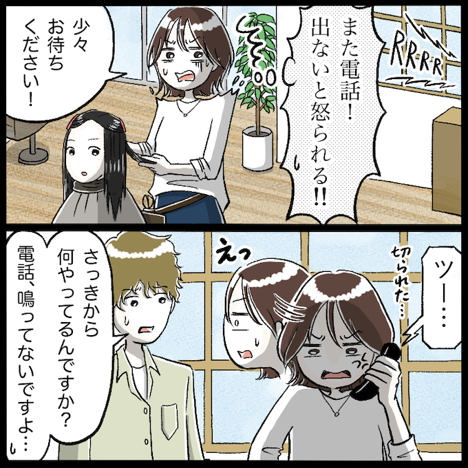 そしてある日、接客中にまた着信が。うんざりしながら電話に出ると、「ツー」という音だけで⋯。すでに切られていました。「なんだよもう! 忙しいのに!」と思いながら接客していたお客さまの元へ戻ると、すぐさま電話の音が。イライラしながらまた電話の元へ向かうと、また「ツー」という音。イタズラ電話だと思い、さらにイライラしていたら、スタッフが「さっきから何やってんすか?」と話しかけてきたんです。「いや、イタズラ電話みたいで。 取ったら切られちゃうんだよね」と答えると、「⋯電話鳴ってないですよ? だ、大丈夫ですか⋯?」と言われたんです。