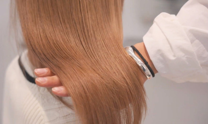 このヘアアイロンの特徴のひとつであるシルクトルマリンプレート®︎は、ダメージを抑えながらツヤを出しやすくしてくれるとのこと。どんな質感に仕上がるのか、実際に試してみましょう。