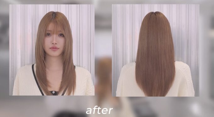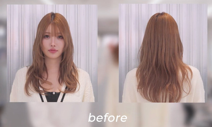 今回のモデルさんは、ブリーチと縮毛矯正の履歴があり、さらにカラーも入っている状態です。ややダメージが気になる部分もあるので、そのあたりもチェックしながら仕上げていきます。