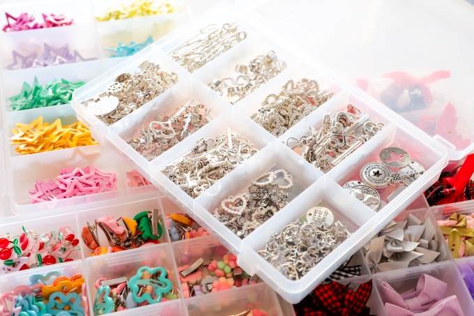 セット面横のワゴンには、ヘアアクセサリー制作のためのパーツがたくさん置いてあります。それを使ってハンドメイドでヘアアクセサリーを作るのですが、直接髪につけることもありますし、色々な使い方ができるんですよ。最近は、だんだんヘアアレンジが工作になりつつありますね(笑)。