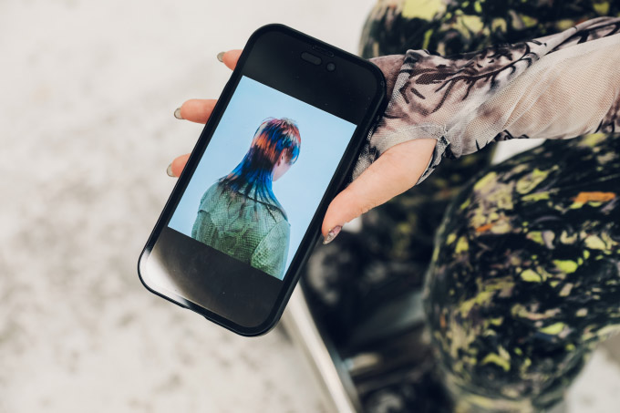 最近は、ヘアだけが映るようなアップのものではなく、ファッションも伝わるような写真を載せるようにしています。というのも、ヘアだけのアップを載せている時期と、ファッション込みで載せている時期とでは、予約してくださるお客さまの層がまったく異なるんですよ。彩度が高めのカラーでヘアのみの写真を載せていると、ヘアだけを派手にしたいというお客さまによく来ていただけます。一方、ファッションも込みで載せると、ヘアもファッションも好き、という方の割合が増えますね。「写真に服も載るなら」ということで、気合を入れて来てくださる方もいて嬉しいです。