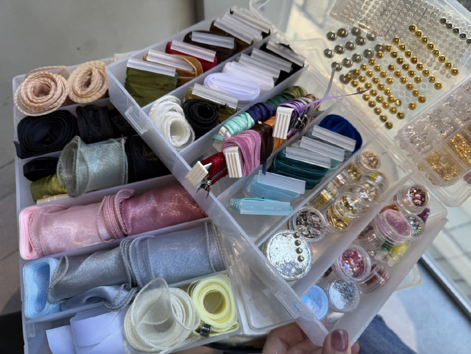 いえ、私が趣味で集めていたものを無料で提供しています。ユザワヤや楽天で購入したものをボックスにまとめていて、そこからお客さまに選んでいただいているんです。それも好評で、「こんなリボンをつけてもらえると思っていなかった」と喜んでいただけることも多く、一緒に選ぶ時間は私自身もとても楽しいですね。シールやラメを髪やリボンに直接付けることもあり、その動画もSNSで10万回再生を超えて注目されました。