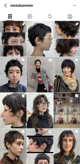 映画やファッションが好きな方が多いですね。私のInstagramのスタイル写真を見せてくださる方もいますし、昔の海外スナップを持って来店される方もいらっしゃいます。美容室でPinterestにあったピクシーカットのスタイルを見せたものの、なかなか希望通りのスタイルにならず、私のところに来店してくださる……というパターンも結構ありますね。
