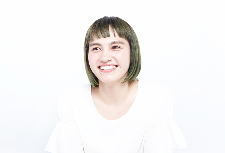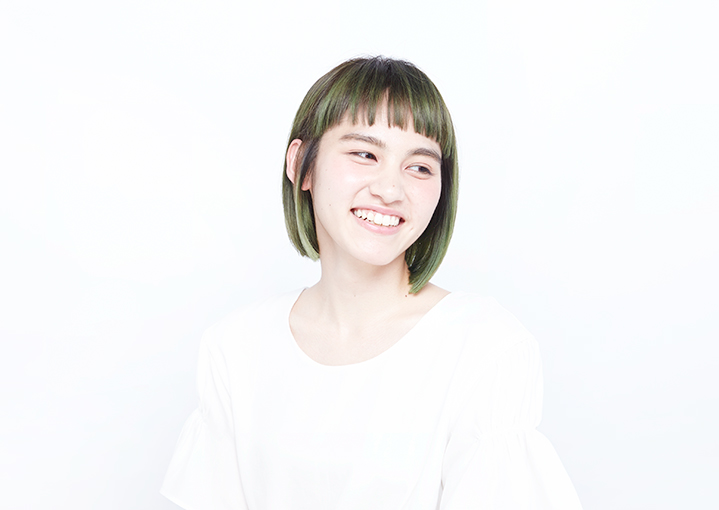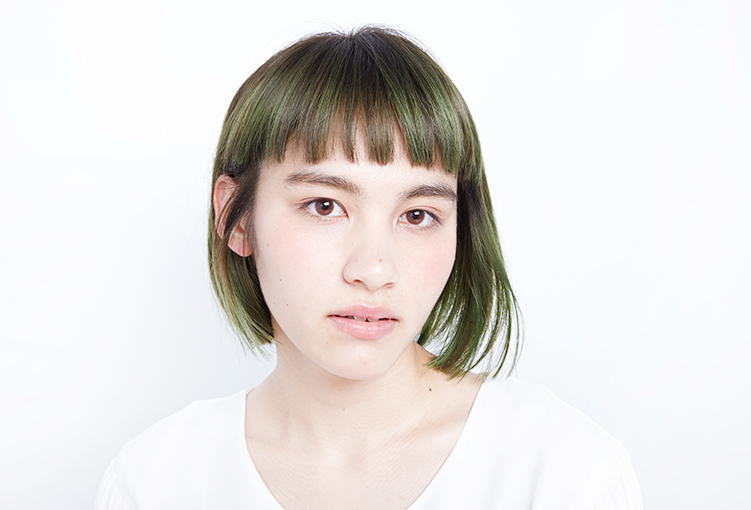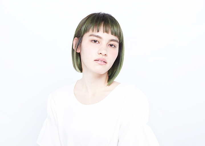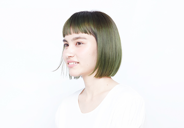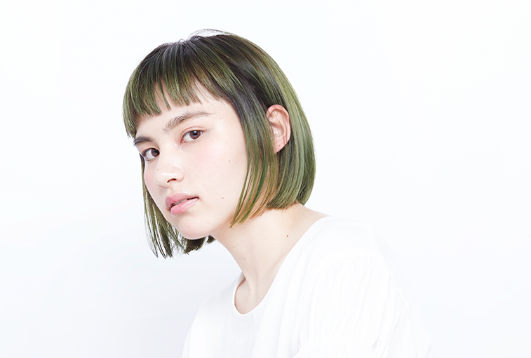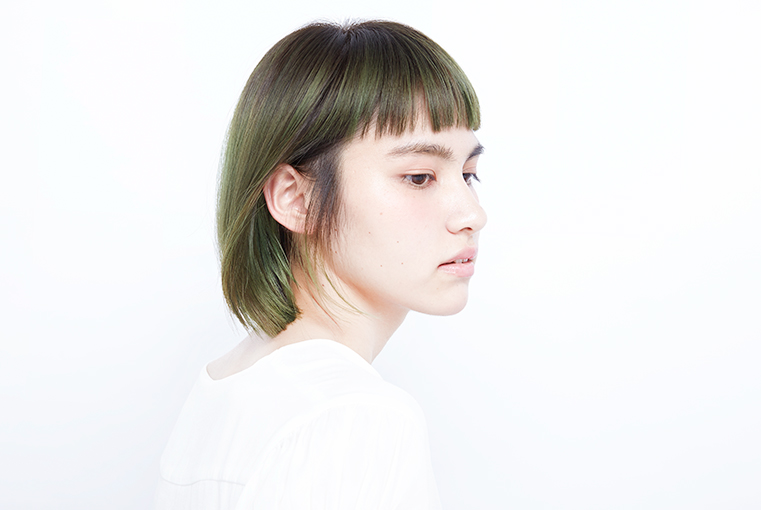 ブラントにカットした潔いボブスタイルです。毛先の動きやグリーンのグラデーションカラーリングでスパイスを効かせました。シンプルだけどカラーが効いているので、定番のファッションも、デザインの効いたファッションもマッチ。ツヤの出るワックスを丁寧になじませてコーミングを。