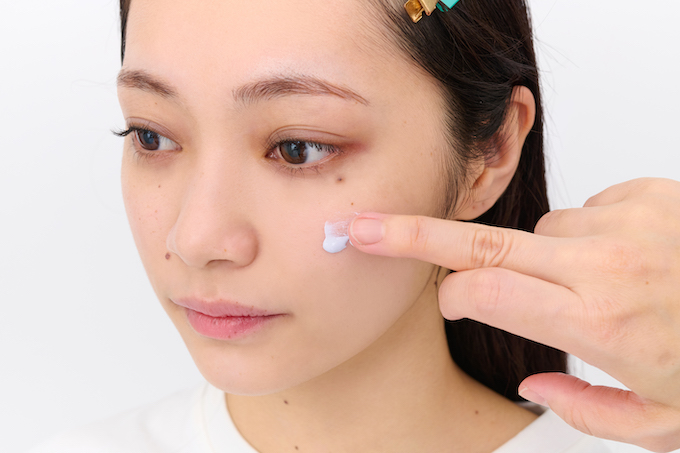 透明感のある肌に仕上げるため、全体にブルーの下地を塗った後、セミマットのファンデーションを重ねる。