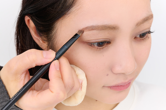 髪色よりも明るいアイブロウマスカラでしっかりと眉毛の色を明るくした後、明るめのパウダリーアイブロウで、ふんわりと仕上げる。