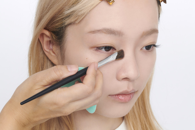 眉頭から目頭の少し下あたりの部分に、マットなブラウンで薄くシェーディングラインを入れる。この時鼻根あたりまで伸ばしてしまうと、一昔前の印象になってしまうので、さりげなく入れるのがコツ。