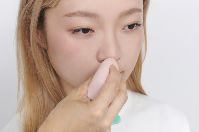 まずはこめかみから小鼻に向かって、コーラルピンク系のクリームチークをぼかしながら塗り広げた後、同色系のパウダーチークでサッと重ねる。また、鼻先と顎先も同じクリームチークを点置きし、指やスポンジでぼかす。その後頬と同様にパウダーチークを重ねて、肌が薄い人のような血色感を作る。
