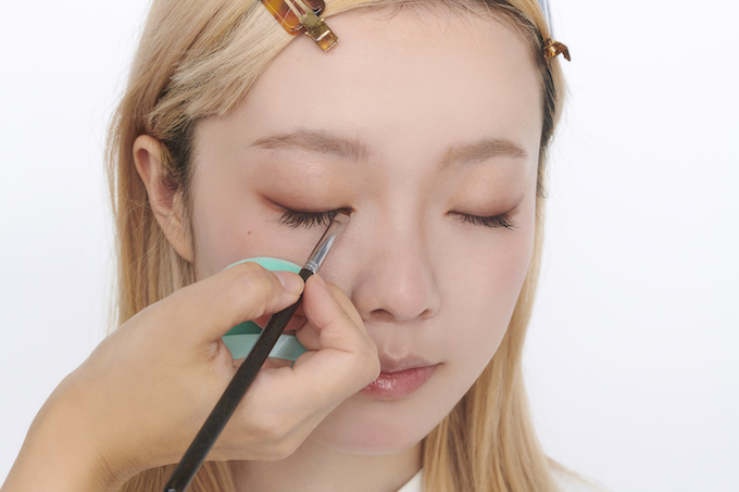 次に目尻側にシマーなベージュを重ねたら、黒のジェルラインやリキッドライナーでまつ毛の隙間を埋めるようにラインを引く。目尻は少し長めにして跳ね上げる。