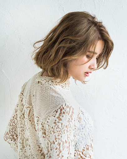 柔らかなレースのトップスやツヤ感のある素材などを着こなす、ちょっとドレスアップしたシーンにも使える大人のボブスタイルです。サイドをゆるくねじってハーフアップにしたり、トップからくるりんぱにしたり…。顔まわりのゆるいウエーブを生かしたさまざまなアレンジで上品かわいい表情を楽しみましょう。