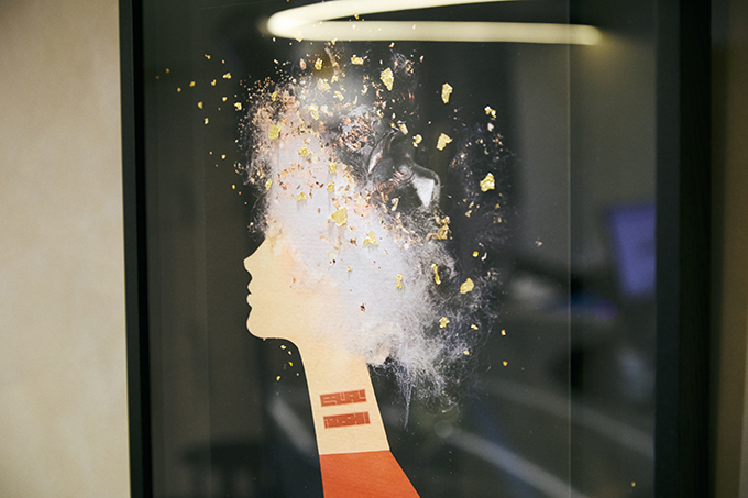 はい。美容師のクリエイティブ作品に価値を持たせたいという思いがあって、一歩踏み出しました。ヘアは実際に作って撮影し、顔はAIで生成しています。さらに和紙や金箔といった素材を組み合わせた一点ものです。これは「似合わせる/似合わせない」をテーマにした表現で、美容師の作品がどうしても“似合わせ”中心になりがちな中、アートとしての新しい価値を示しています。