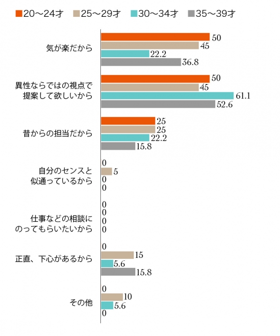 また “自分のセンスと似通っているから”“仕事などの相談にのってもらいたいから”を、一番多く理由に上げた年代は30代前半。同性の美容師との会話を楽しみにサロンへ通う人も少なくはなさそうですね。