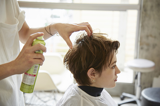 コテで毛先にニュアンスをつけた後、最後に全体に軽くスプレーを振って、スタイリングが終了。スタイリングは3~4分ほどで終了してしまい、本当にあっという間!