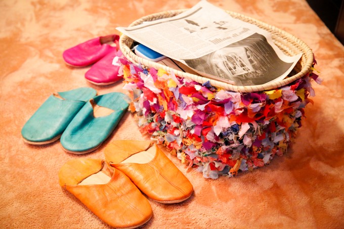 モロッコで購入したカゴとバブーシュ。カゴには雑然としやすい細々したものをポンポン入れているんだそう。