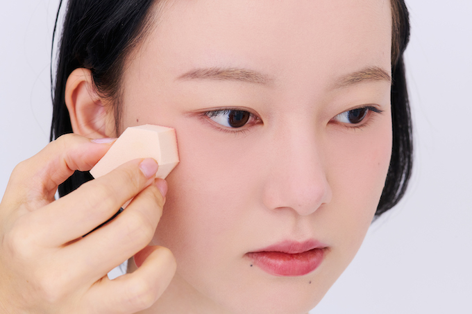 目の下から鼻にかけて、ほぼ一直線にピンクのリキッドチークをのせ、スポンジでなじませていく。雪焼けしたような、ほんのり火照った血色感をチークで表現する。