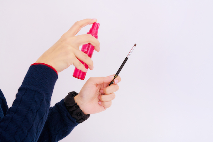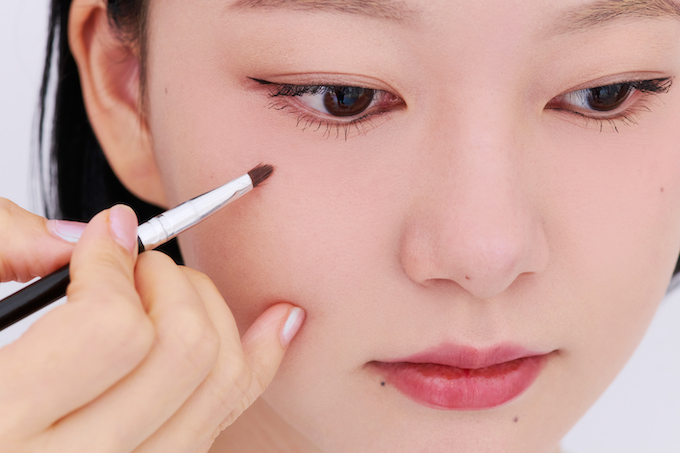 最後に、細いブラシにフィックススプレーを含ませ、ライトブラウンなど好みの色のシャドウで、やりすぎない程度にそばかすを描き足す。