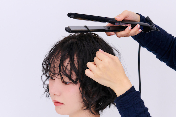 ストレートアイロンで根元を立ち上げるようにクセづける。