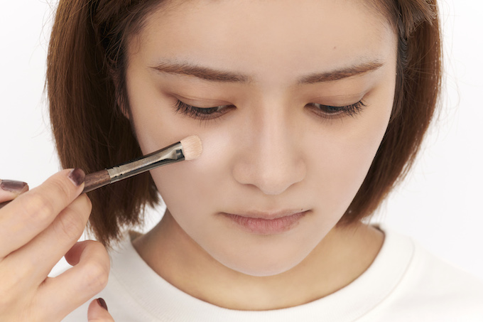 目の下、鼻の横の三角ゾーンにマットなハイライトを入れ、顔に立体感を作る。その後、鼻根の付近、おでこにサッとシェーディングを入れる。赤みピンクのクリームチークを、頬骨の高い位置に横に広く薄く伸ばしたら、その上から同色のパウダーチークを重ねる。