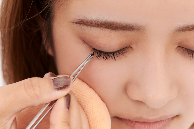 アイホールにベージュのシャドウを広げ、同色のシャドウを二重幅に重ね塗りし、奥行きを出す。黒のジェルライナーでまつ毛の隙間を埋め、リキッドライナーで気持ち跳ね上げた極細ラインを描く。まつ毛は黒目の上がくるっとカールするようにビューラーをした後、黒のマスカラを塗る。その後、ピンセットにマスカラを塗り、まつ毛全体を束にする。下まつ毛は軽くマスカラを塗る。
