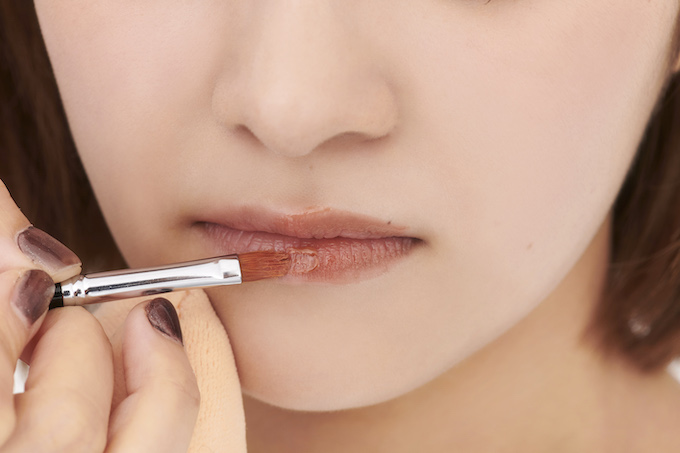 ファンデで唇の色をフラットにしたら、マットピンクのリップを塗り、その上からベージュのグロスを重ねてフィニッシュ。