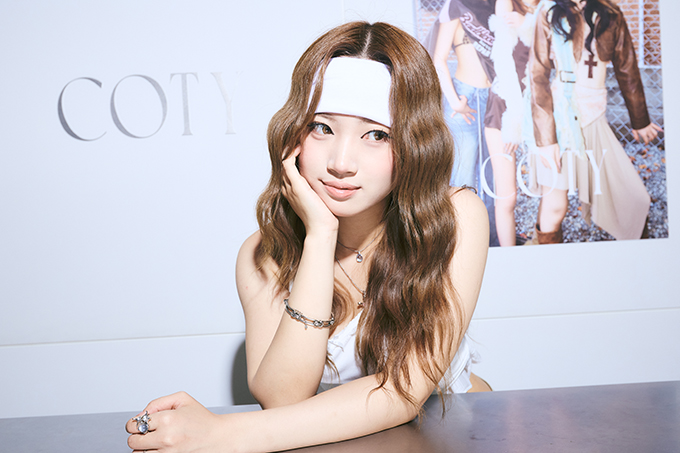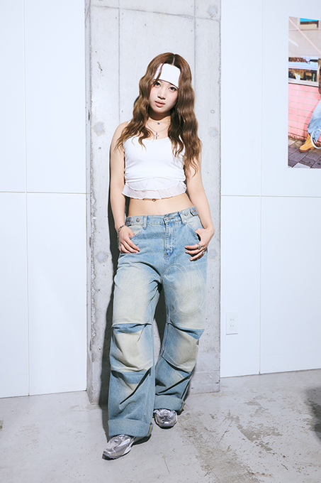 ヘアカラーは、肌の色味とマッチしたベージュで、血色が良く見えるトーンにこだわっています。ハイレイヤーを生かし、全体をウェーブ巻きで動きをプラス。ヘアバンドと組み合わせてK-POPアイドルの雰囲気に。