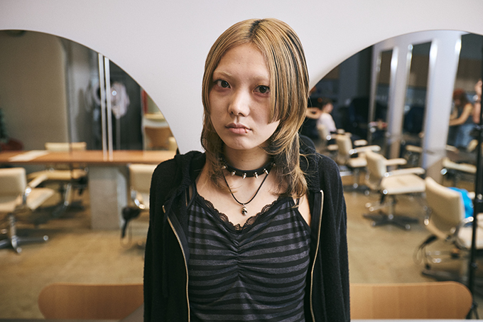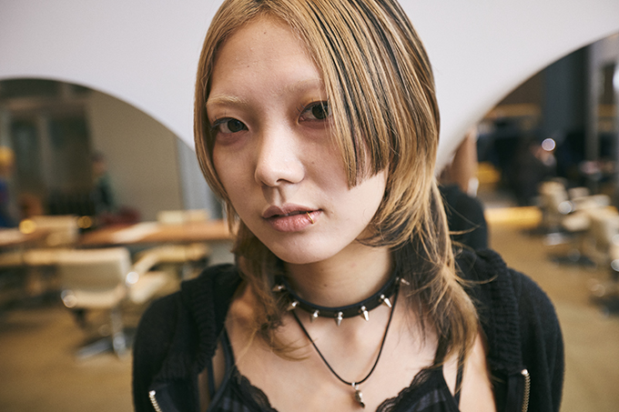 ポイントは、ハッシュカットと姫カットとのマッチング。切り込んである分、ワンカールだけでも表情が生まれて、アクセントになります。またローライトで毛流れを効かせつつ、カラーチェンジしやすいオフブラックで今っぽさを演出。