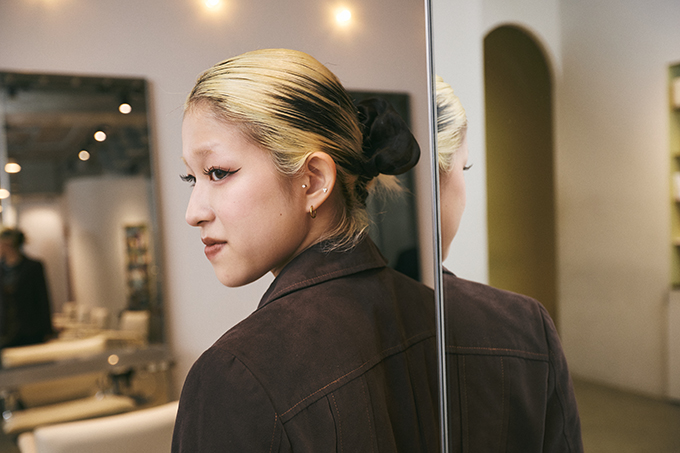 ブロンドヘアは、リタッチのみで繋げてきました。色のコントラストを楽しめるように、オフブラックの黒をプラス。自然に見えるように黒をぼかし入れることで、ダルメシアンヘアに。シンプルだからこそ、デザインと工夫を仕込むのがポイント。