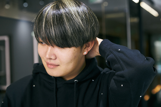 長めワイドバングをポイントにしたマッシュスタイルで、メッシュのデザインカラーを強調しています。どこか上品さを感じさせるメッシュに仕上げるには、定規で計ってもズレのない均等な配置が決め手に。クリーンな雰囲気を際立たせるサラサラ感も必須。