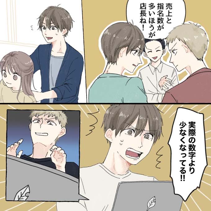 しかし3カ月経って売上を確認すると、実際の売上数より数字が明らかに少ない…。指名売上の入力はパソコンでしているのですが、なんと競っていた男性スタイリストにデータを改ざんされていたのです。結果、その男性スタイリストが店長に決まりました。