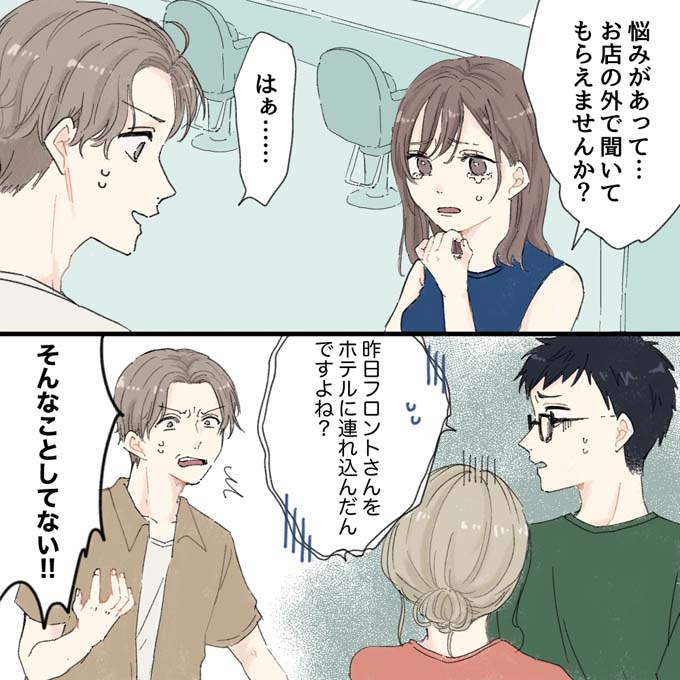 そして次の日。出勤すると、アシスタントたちが僕を軽蔑するような目で見ながら、ヒソヒソ内緒話をしていたのです。何があったのか問い詰めると「昨日フロントの〇〇さんをホテルに連れ込んだんですよね?」というまさかの返事が。