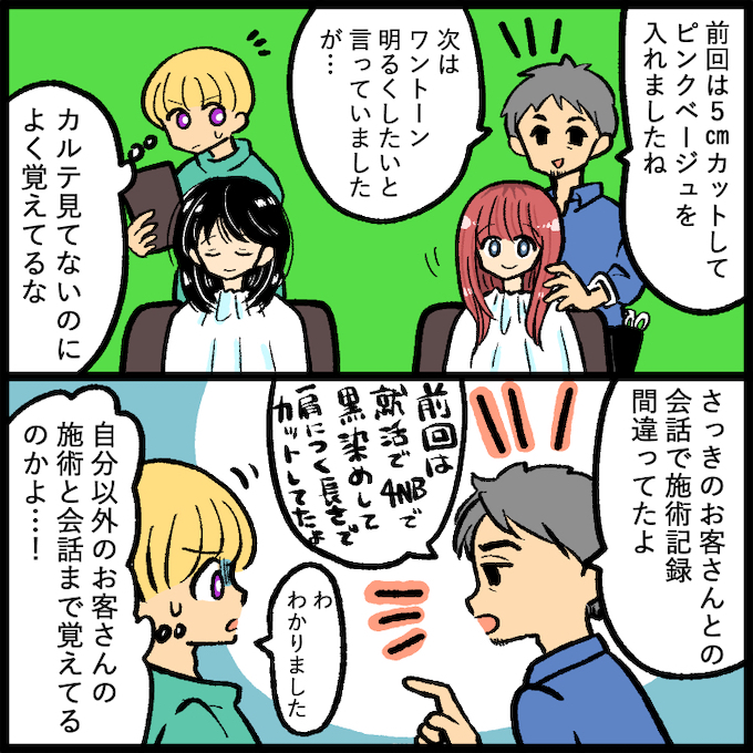 以前、その人に「さっき君が担当していたお客さんの会話を聞いていたけど、前回の施術記録、間違っていたよ。前回は就活のためにギリギリ結べる長さでカットしていたし、4NBで黒染めしてたよね?」と言われたときには、あまりの記憶力に気味が悪く感じ、鳥肌が立ちました。すべてのことが覚えられているかと思うと、その人の近くでお客さんやスタッフと気軽に会話することも躊躇してしまいます。